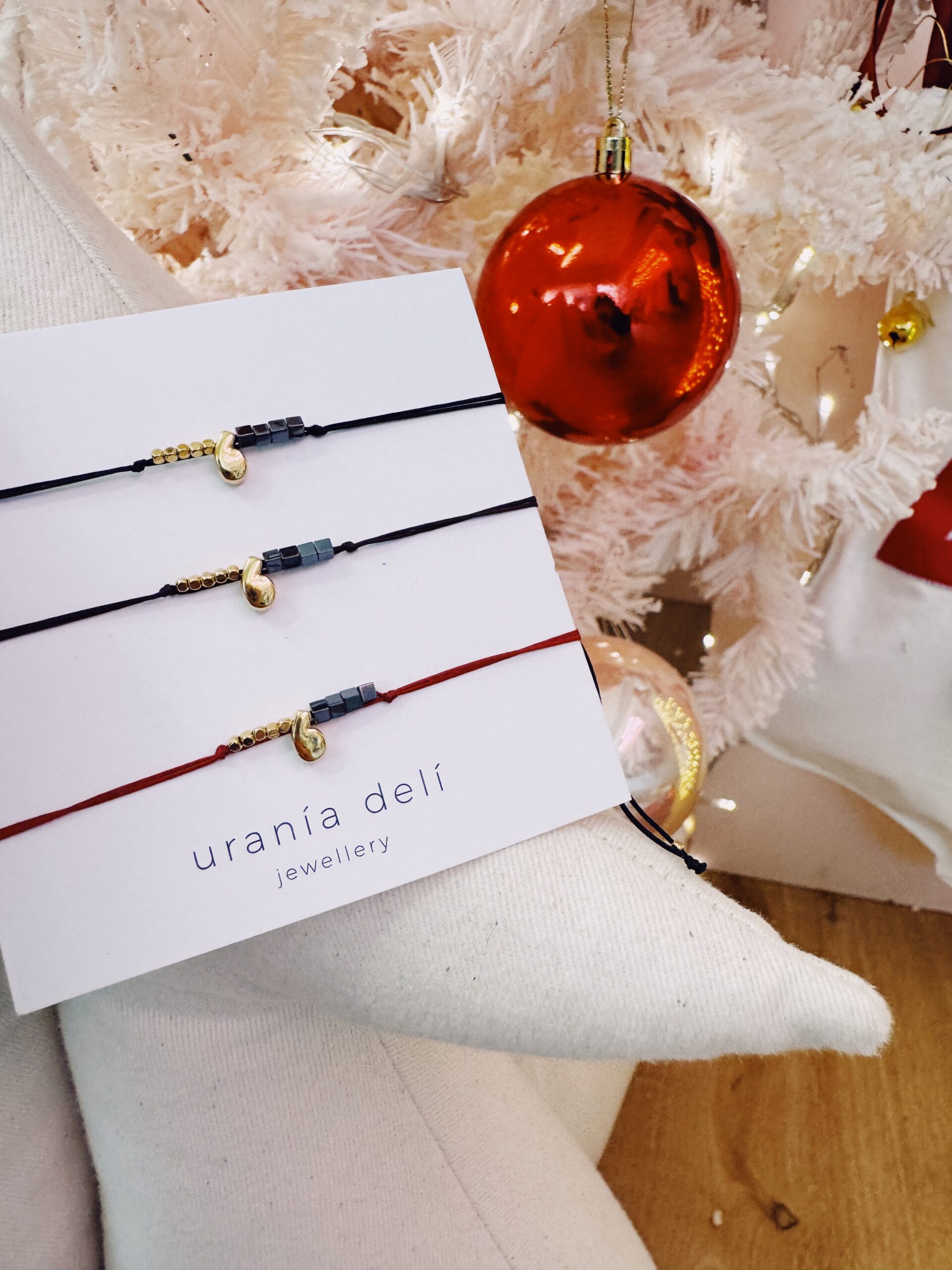 Λεπτό κορδόνι, με μικρή χρυσή «σταγόνα» για 6 και μοντέρνες γεωμετρικές χάντρες που δημιουργούν ένα μοναδικό κόσμημα που συνδυάζεται εύκολα με ρολόι και άλλα βραχιόλια.