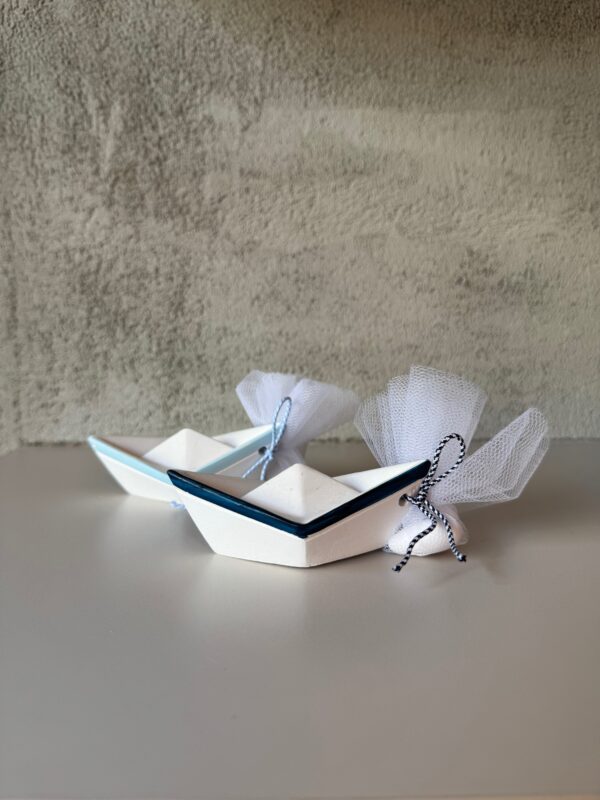 Κεραμική μπομπονιέρα σε σχήμα καραβάκι. Εμπνευσμένη από τα νησιά μας και την αλμύρα της θάλασσας. Μια μπομπονιέρα στολίδι με τη διαχρονική αξία του μπλε. Στην τιμή περιλαμβάνονται τα κουφέτα Χατζηγιαννάκη.
