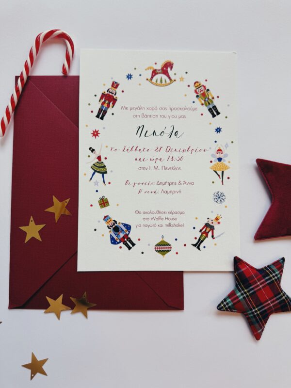 Προσκλητήριο The Nutcracker Theme. Όλο το παραμύθι του καρυοθράυστη σε μια ιδιαίτερη πρόσκληση με το κλασικό θέμα των Χριστουγέννων, αλλά αλλιώτικα. Ό,τι πρέπει χειμερινές βαπτίσεις. Μπορεί σύμφωνα με το θέμα αυτό να γίνει όλο το βαπτιστικό πακέτο.