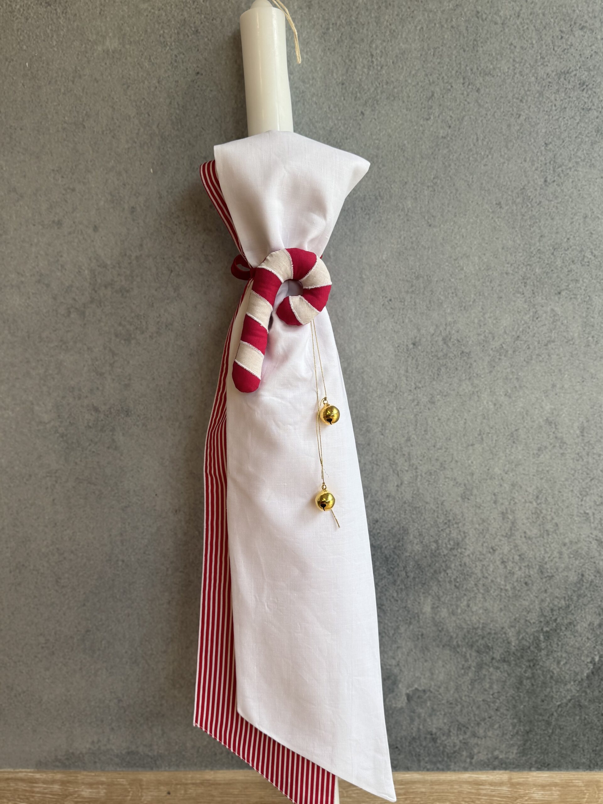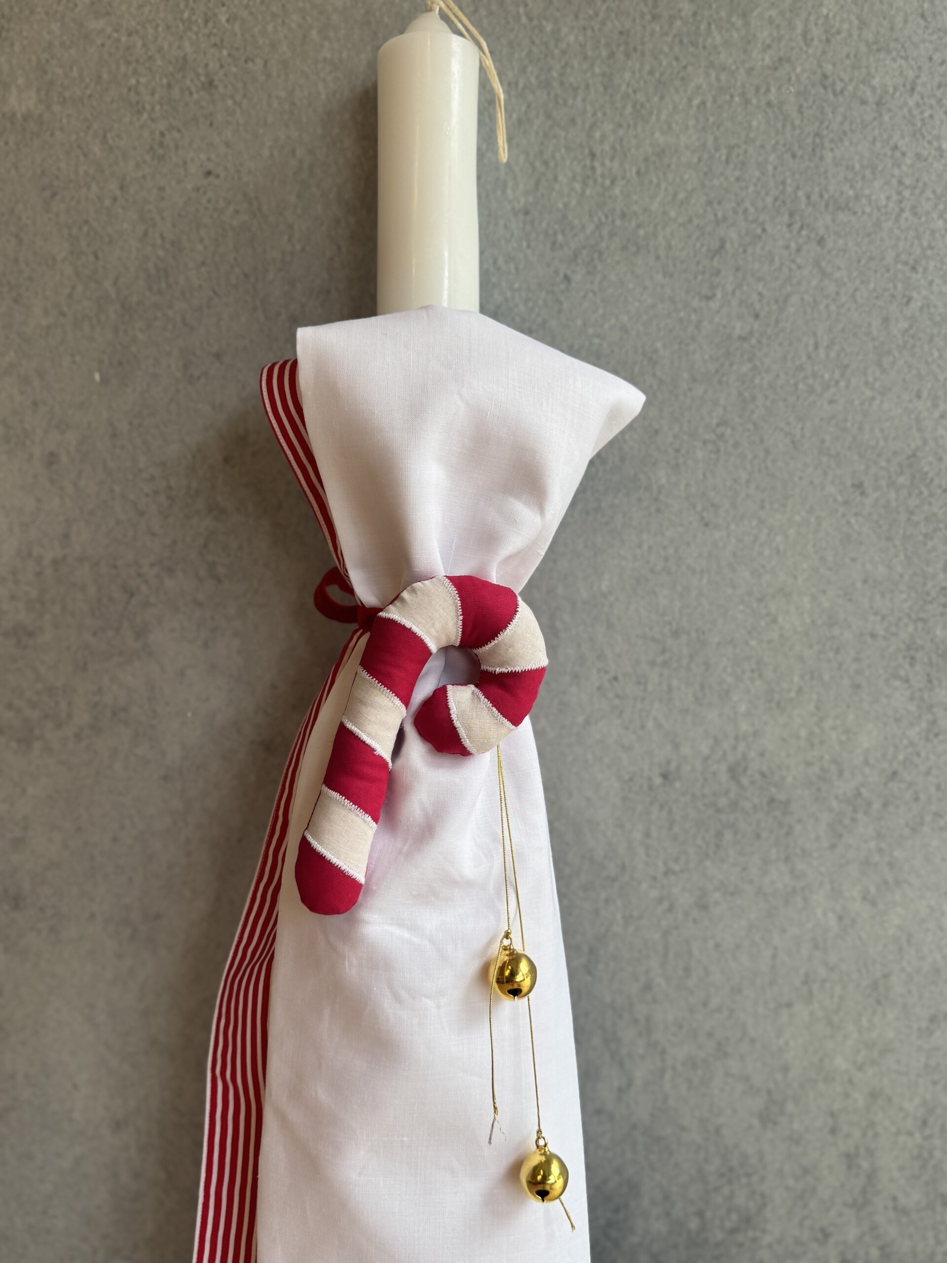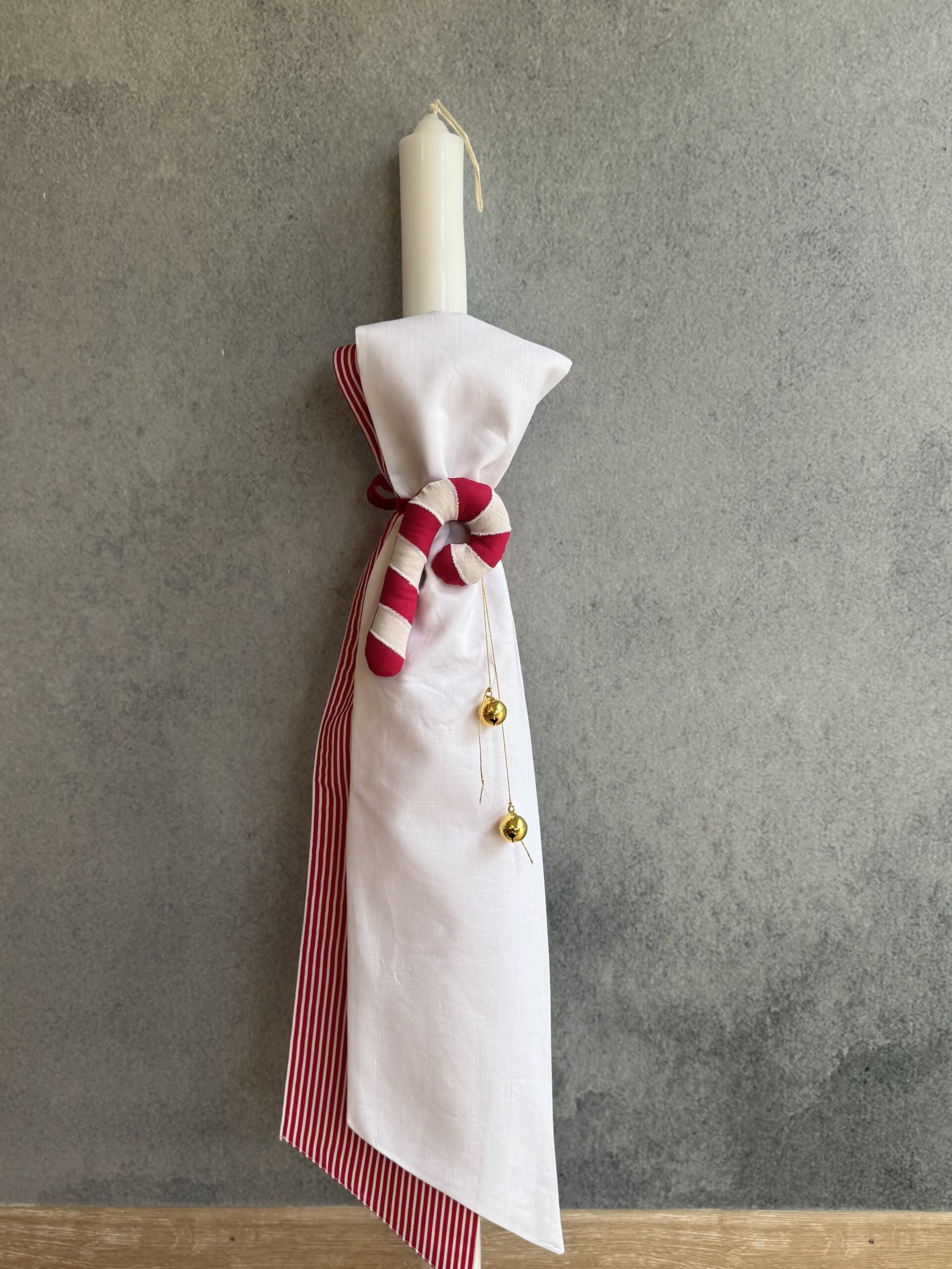 Ασορτί λαμπάδα με υφασμάτινες λινές γραβάτες και μαξιλαρένιο στολίδι χριστουγεννιάτικο και κουδούνι (125€).